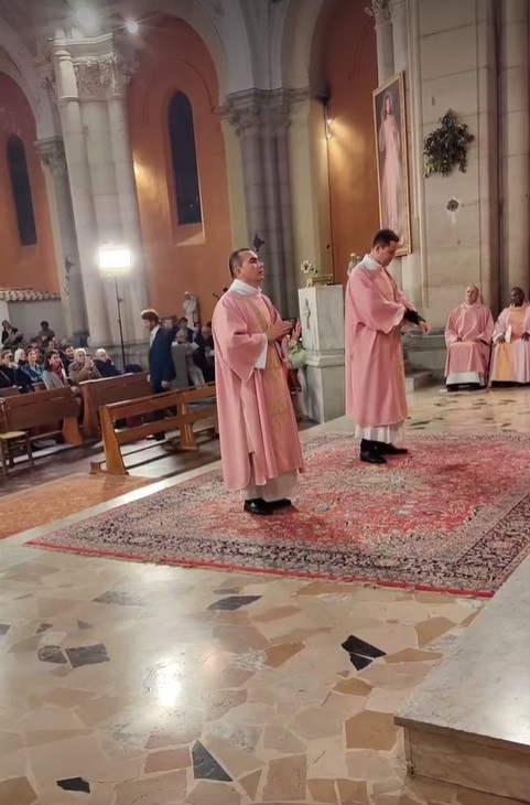 Marc-Antoine et César se sont avancés il y a un instant. Ils vont bientôt exprimer devant l’assemblée leur intention d’assumer toutes les charges du ministère diaconal, et de vivre aussi l’obéissance envers leur évêque. Une fois ordonnés, ils recevront le livre des Evangiles avec cette parole : « Recevez l’Évangile du Christ que vous avez la mission d’annoncer. Soyez attentif à croire à la Parole que vous lirez, à enseigner ce que vous avez cru, à vivre ce que vous aurez enseigné. » C’est du concret : vivre ce que l’on enseigne ! Ils s’inscrivent dans le sillage d’Isaïe et de Jean-Baptiste pour être des serviteurs de la joie par leur action concrète. « Que votre bienveillance soit connue de tous les hommes », nous dit saint Paul dans sa lettre aux Philippiens. Dans ce monde marqué par tant de tristesse, d’angoisse et d’inquiétude, le diacre est envoyé pour faire resplendir la beauté de l’Évangile, pour manifester dans les réalités de ce monde que Dieu est présent et que son nom est Emmanuel, Dieu avec nous. Le monde a soif et faim de justice et de paix, d’amour et de vérité, de lumière et de confiance. Par son ministère, le diacre ouvre son cœur aux détresses et aux pauvretés, il s’engouffre dans les vallées profondes et ténébreuses, il franchit les montagnes qui font obstacle à la rencontre, il recueille et distribue avec grande bonté l’eau de la source qui jaillit dans le désert. Vous avez sans doute déjà remarqué le visage d’un malade qui bénéficie d’un soin apaisant, d’un enfant perdu qui est retrouvé et consolé, d’un pauvre auquel on est attentif, du mendiant qui reçoit un morceau de pain, du détenu qui est libéré, de la personne victime qu’on écoute. Le diacre est serviteur de cette joie du renouveau, de la renaissance, de la résurrection. Il est serviteur de la joie, non pas en animant la fête, mais en étant témoin humble et caché de la présence douce et aimante du Seigneur qui se fait proche, tel un frère. Reprenant le geste de celui qui porte le brancard avec d’autres pour monter le paralysé sur le toit et le descendre auprès de Jésus, reprenant le geste du samaritain qui conduit le blessé à l’auberge, prend soin de lui, donne de l’argent et demande de ses nouvelles, reprenant le geste de ceux qui sont passés dans la foule avec les corbeilles pour distribuer le pain et les poissons, reprenant le geste de Jésus qui se met à genoux pour laver les pieds de ses disciples, le diacre apporte la joie profonde du salut, la joie qui jaillit dans nos cœurs au jour de Noël, la joie d’accueilir Jésus qui vient, la joie de recevoir ses bienfaits. Avec la grâce que vous recevez du Seigneur par l’imposition des mains et le don du Saint-Esprit en ce Dimanche de « Gaudete », chers frères Marc-Antoine et César, vous devenez diacres de la joie. Tout au long de l’année du jubilé, et même au-delà, vous ferez que ce soit Noël chaque jour.