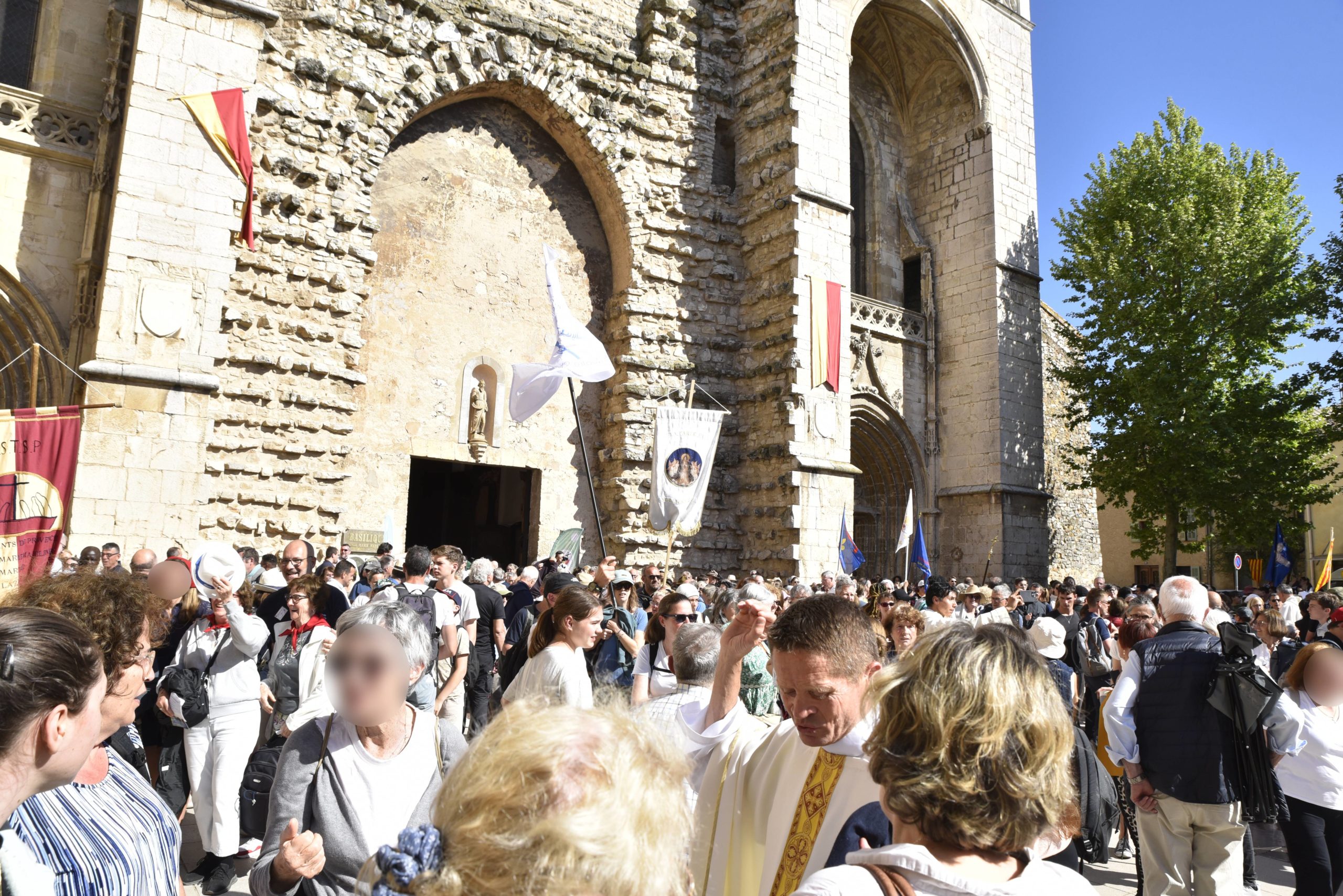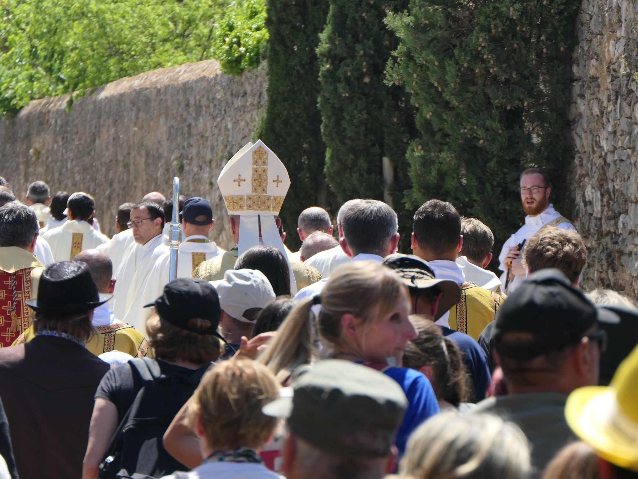 Nous avons quitté notre tranquillité ou notre confort, surtout en cette journée chômée et ensoleillée du 1er mai, pour participer, pour partir en pèlerinage, pour nous mettre ou nous remettre en route. Physiquement parlant, nous avons parcouru des kilomètres ce matin. J’ai été heureux de faire le chemin depuis la Sainte Baume. Dans l’invisible de nos cœurs, nous avons avancé, progressé, et nous allons ensemble vers le Seigneur Jésus, franchissant les obstacles jonchant la route et ne nous laissant pas décourager par la dureté du chemin, la météo changeante de certains jours, les épreuves de la vie, les relations humaines tendues, les fardeaux de la pauvreté ou de la maladie, la douleur de nos péchés, le poids de nos échecs et de nos infidélités. Nous sommes appelés à sortir de nos crispations et de nos clivages, et à accueillir ce que le Seigneur nous donne de vivre.